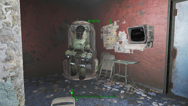 Took out a few synths here; which confirms that Kellogg is working for the Institute. Synths seem to be resistant to my VATS shots, and because I haven't picked up that analyze perk yet, I'm unsure of what their exact weakness is. I do know that me walking around in Grognak's barbarian attire is the WORST tactical decision for a firefight with synths using energy weapons.